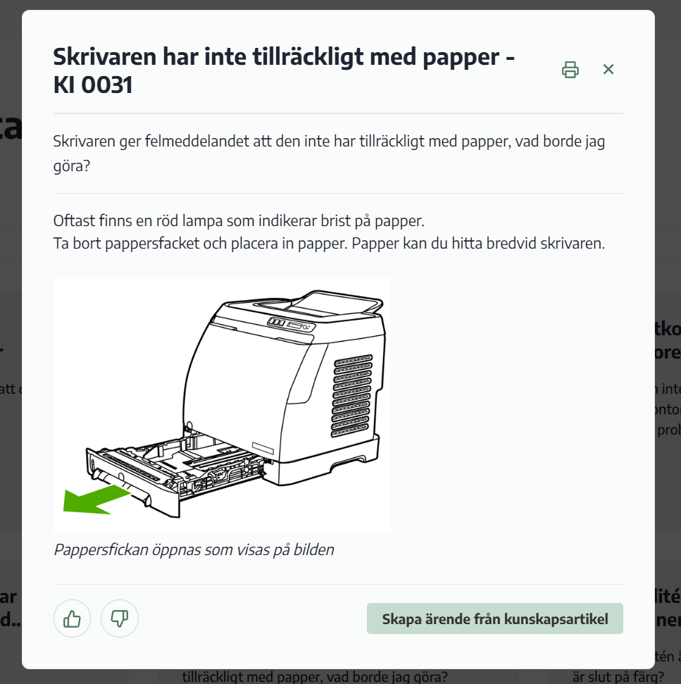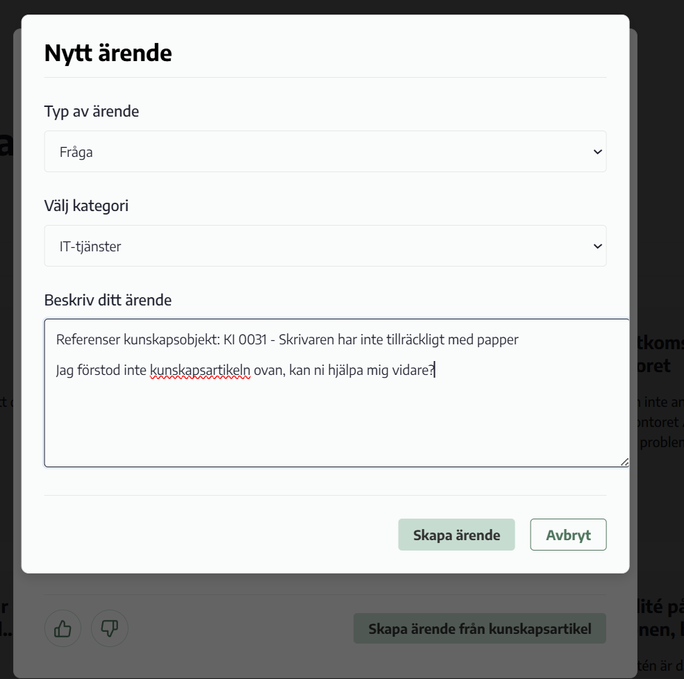 Om en artikel inte löser problemet kan användaren skapa ett nytt ärende direkt från samma vy. Artikeln bifogas automatiskt som referens, vilket underlättar både för användaren och supporten.